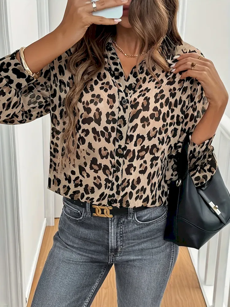 Women Elegant Leopard Print Long Sleeve Loose Shirt