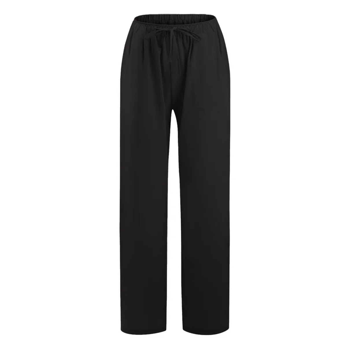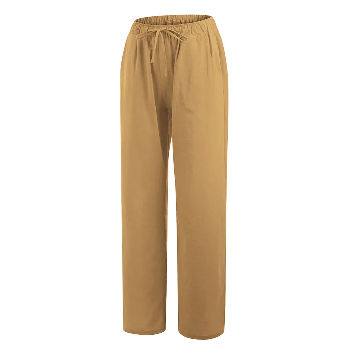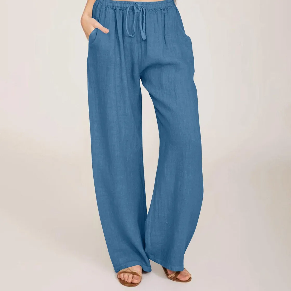 Women Fashion Casual Solid Color Linen Loose Wide Leg Drawstring Pants