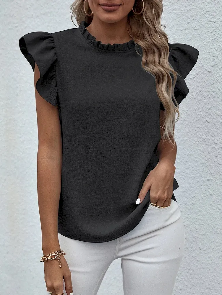 Women Fashion Casual Solid Color Ruffled Round Neck Sleeveless Blouse