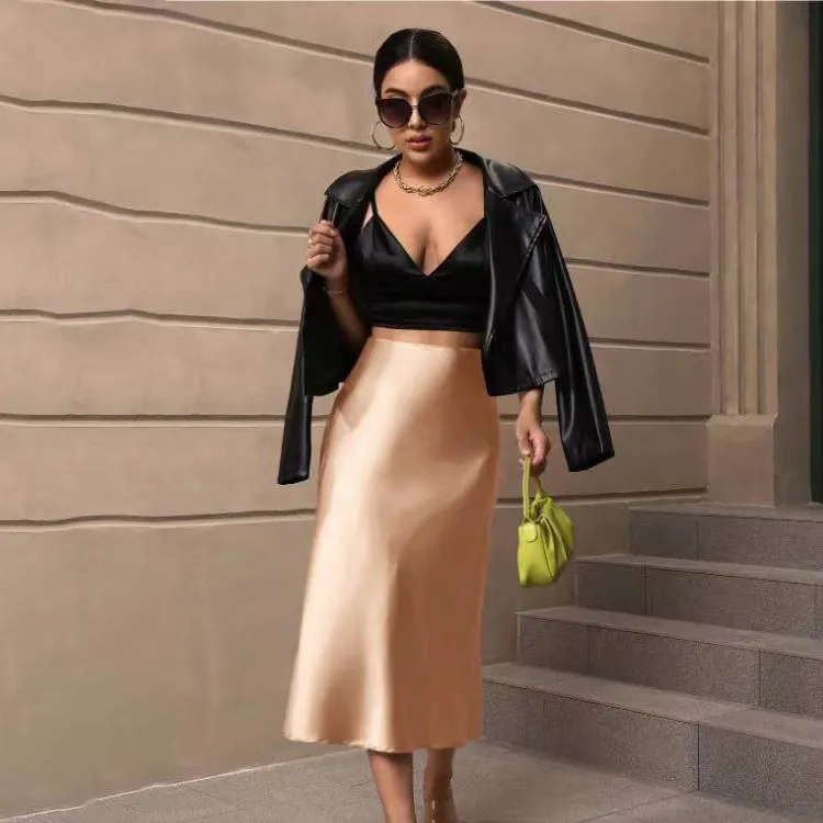 Women Fashion Sexy Solid Color Satin Mid-Length Skirt