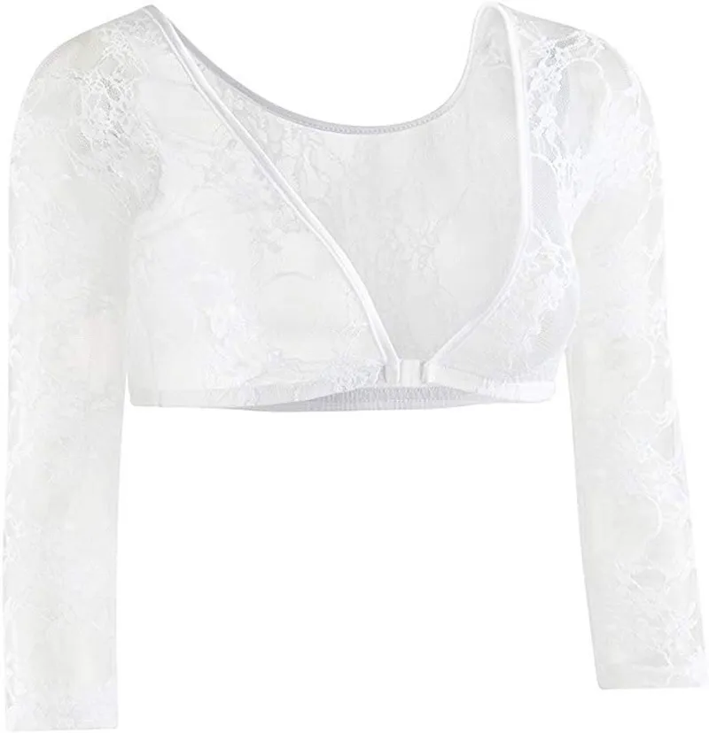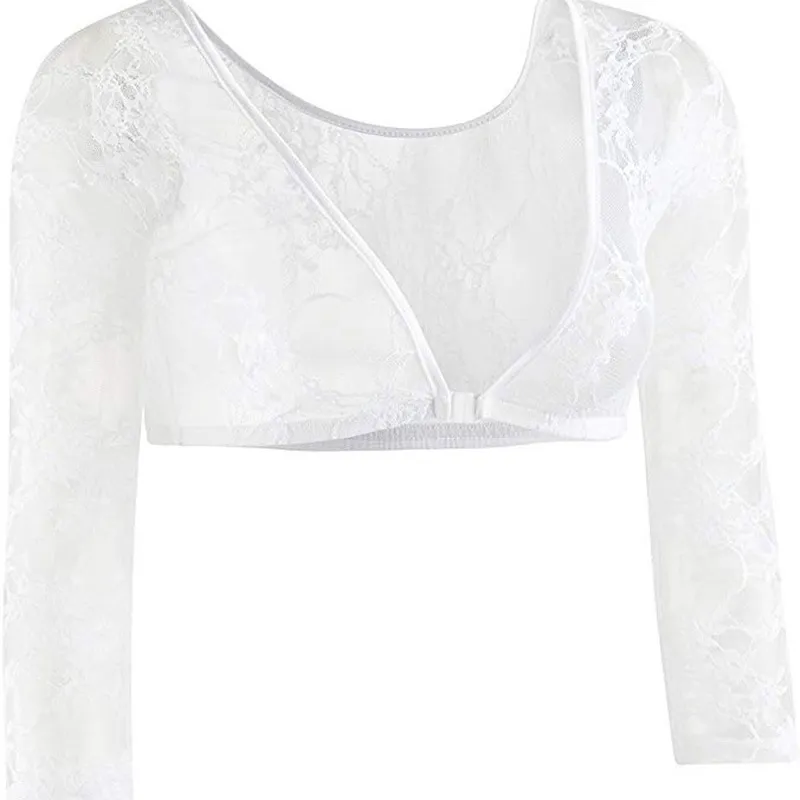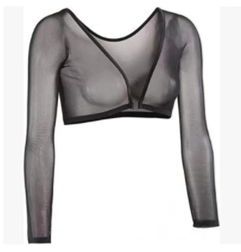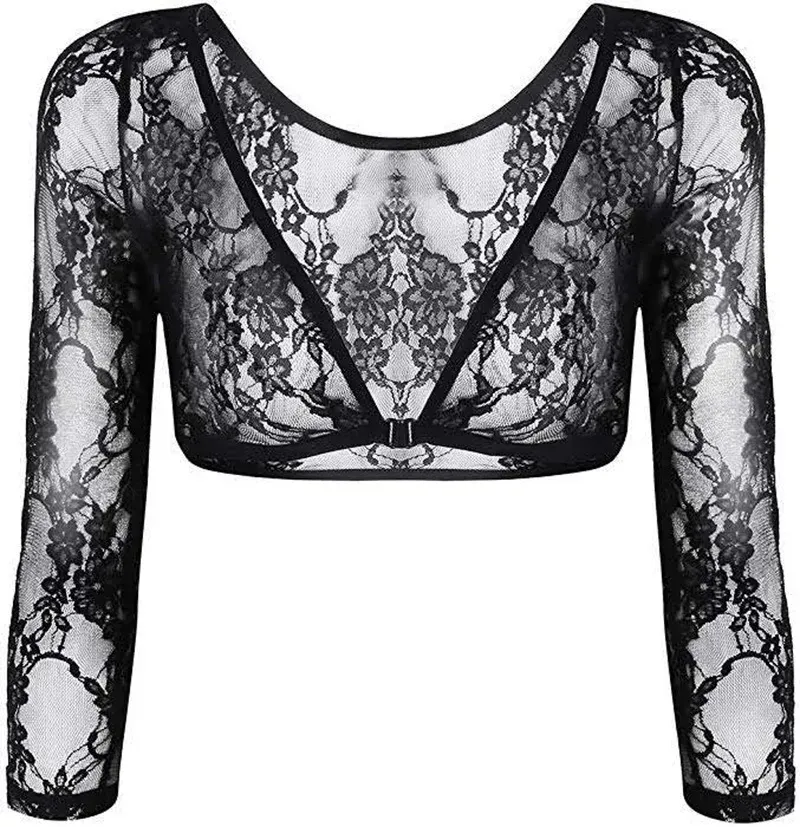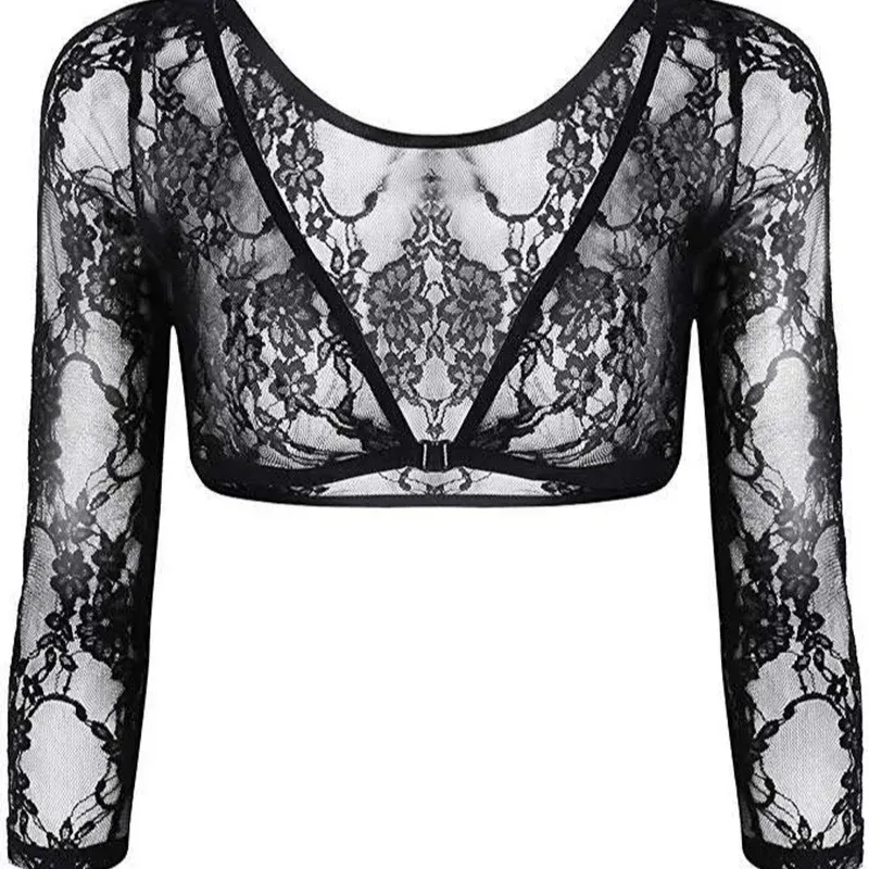 Women Fashion Sexy Solid Color See-Through Lace V-Neck Long-Sleeve Crop Top