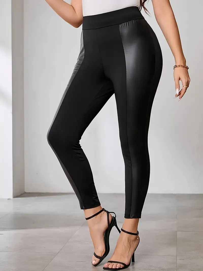Women Fashion Simple Plus Size Pu Leather Splicing High Waist Pants